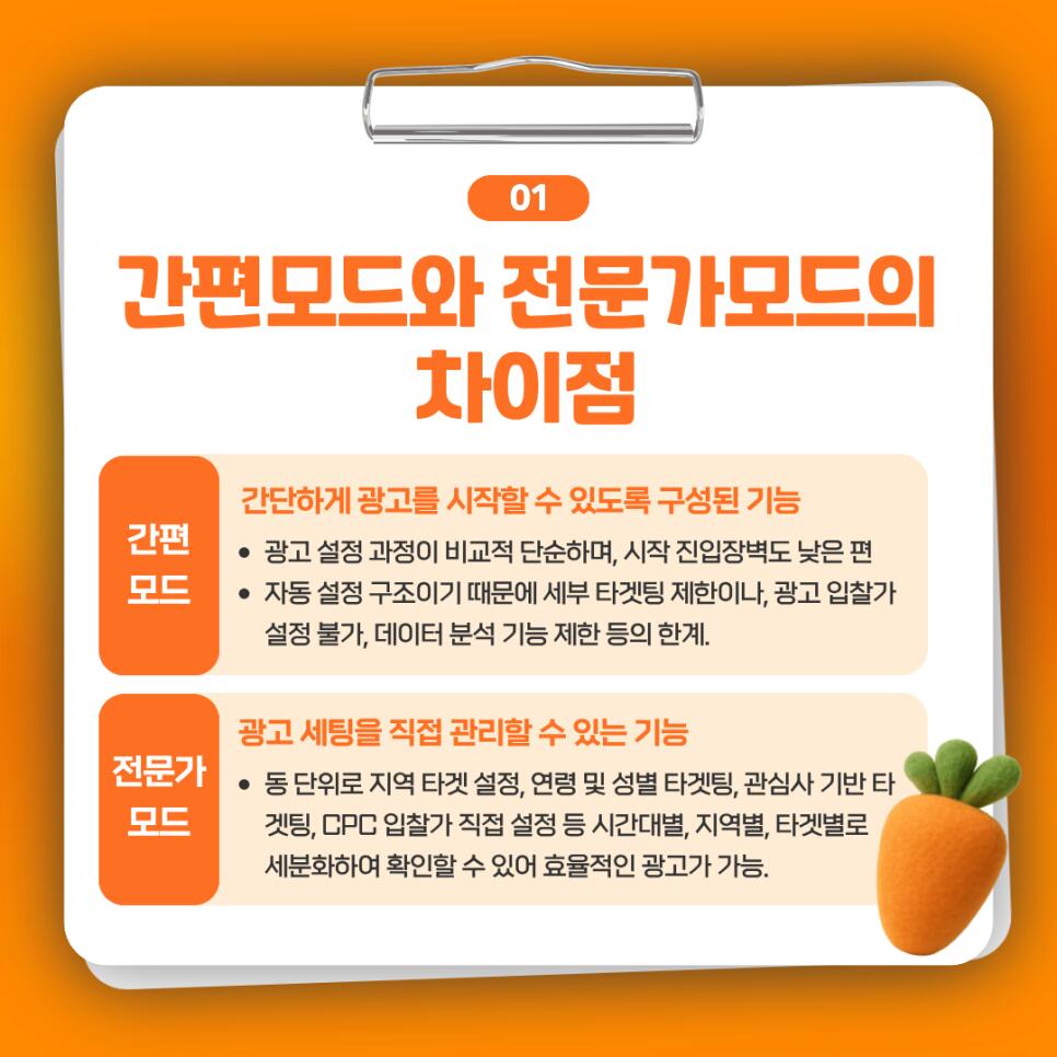 | 타겟팅 | 동네 선택, 반경 설정 | 지도 직접 그리기, 관심사, 성별, 연령 |
